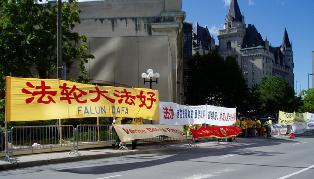 9日上午,加拿大魁党亚太事务发言人、国会议员罗杰-克莱文(Roger Clavet)出现在国会山大草坪法轮功学员请愿现场,克莱文同法轮功学员合影,并说,“我一会儿会见到胡锦涛,会同他提法轮功问题。”议员大卫-乔高(David Kilgour)也赶到国会山支持请愿的法轮功学员。