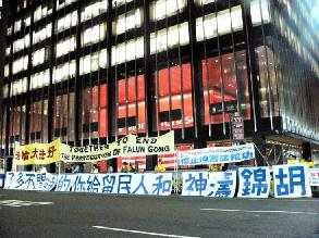 “法轮大法好”,“真善忍”,“停止迫害法轮功”,“法办江泽民 法办罗干 法办刘京 法办周永康”,“法办迫害法轮功的恶警和坏人”,“胡锦涛,神和人民给你的时间是有限的”等大型横幅清楚的表达了法轮功学员的心声。安静祥和的炼功和发正念,展现着法轮功学员请愿与众不同的平和。历经了六年多残酷的迫害,法轮功学员始终如一的秉持着和平理性的态度反对迫害,并怀着修炼人所拥有的慈悲心态对来访美国的胡锦涛及其随行人员发出真诚的呼唤,希望他们能够抓住这难得的机会,了解法轮功真象,停止迫害,为自己选择一个光明的未来。