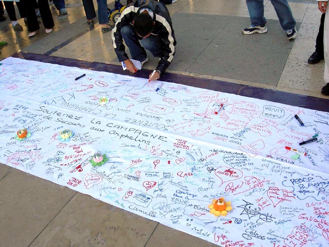 【明慧网2005年9月20日】“每逢佳节倍思亲”,2005年9月18日下午,秋高气爽,阳光明媚,法国巴黎法轮功学员在著名的旅游胜地巴黎人权广场举行了呼吁营救法轮功孤儿义演征签活动。当日正值美好的中秋佳节,巴黎学员以此表达海外法轮功学员对中国大陆法轮大法弟子节日的问候和美好的祝愿。让我们共同努力停止这场残酷的迫害