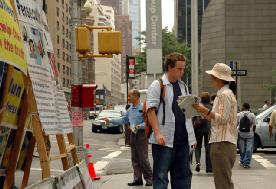 【明慧网2005年9月23日】这一天,曼哈顿讲真象的法轮大法弟子在53街Lexington大道上,如往常一样将真象展板整齐的摆好,开始了发材料、功法演示等活动。一辆大“卡迪拉克”停到反