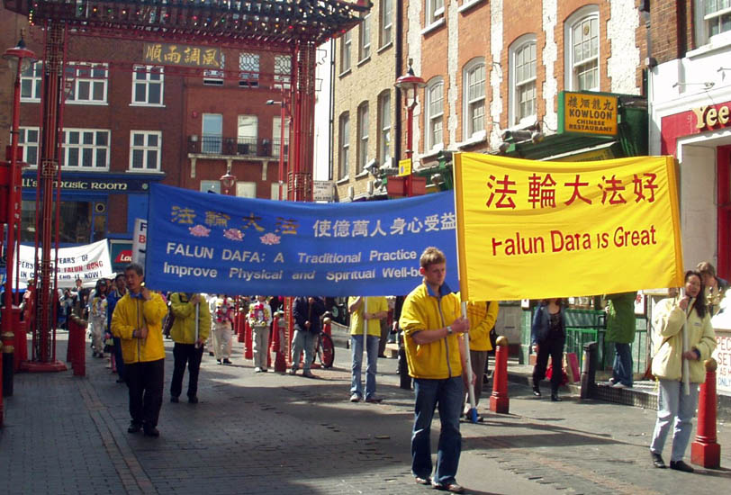 沿途的人们清晰的看到这群有许多中国人面孔的游行队伍中,身着素衣的女士和孩童举着被中共迫害致死的法轮功学员的遗像,高举的横幅传达着“在中国,法轮功学员正被酷刑虐杀”的消息和“立即制止中共对法轮功七年的迫害”、“制止中共劳教所活体盗取人体器官”的呼吁。还有那面金黄色的“法轮大法好”横幅,以及“世界需要真、善、忍”和“法轮大法使亿万人身心受益”的横幅,散发着善的力量,和平而坚韧不屈。