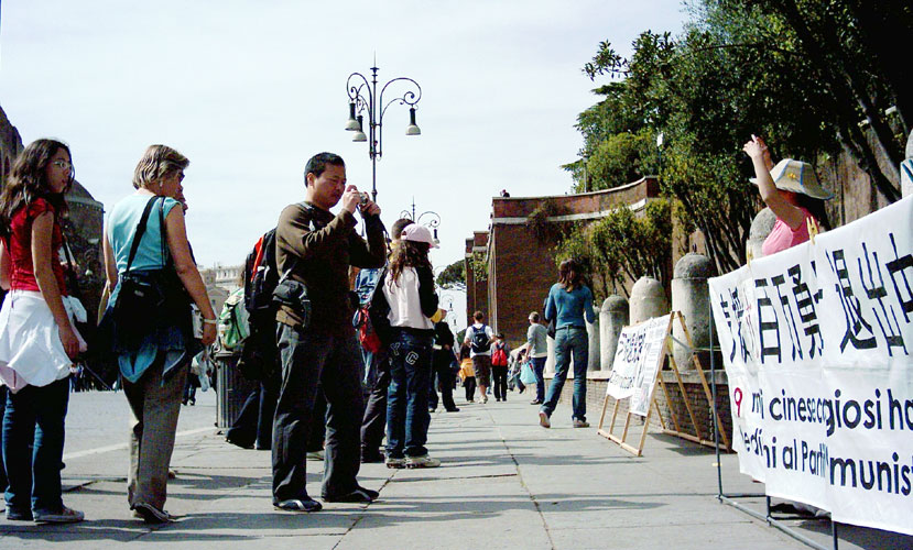 【明慧网2006年4月25日】2006年3月以来,多位证人揭露在中共劳教所和监狱里发生的对法轮功学员活体器官摘除以牟取暴利的兽行后,罗马法轮功学员持续在意大利总理府前和罗马市中心的帝国大道揭露中共的罪恶,呼吁意大利政府和国际社会关注此事,并帮助制止中共的暴行。此外学员们还打出横幅,声援千万民众退出中共。
