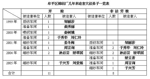 类似于秀华的遭遇,在棉纺厂绝不是个别案例,几年来,都本仁积极配合当地迫害法轮功的专门机构610办公室,指使爪牙林爱国等人不断的对其厂的大法弟子进行骚扰迫害,小则威胁恐吓、大则绑架关押,多人因不堪其辱,或辞职回家,或搬出棉纺厂。据不完全统计,从99年迫害开始至今,已有十多名棉纺职工因信仰“真、善、忍”做好人而遭到开除或非法劳教。就在2006年4月,又传出一名大法弟子,细纱车间的姚永华被绑架……