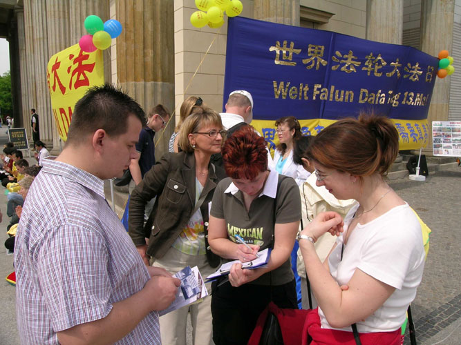【明慧网2006年5月15日】(明慧记者吴思静德国柏林报道)“5·13”是世界法轮大法日。李洪志老师在1992年的这一天,正式开始在中国传播法轮功。这一天也是李老师的生日。在法轮功传出14周年之际,2006年5月13日,德国学员在柏林(Berlin)等几个城市同时举办庆祝活动,并继续揭露中共迫害法轮功的真相,呼吁共同制止迫害。