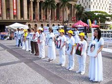![]() 法轮功学员在人民公园正门前炼功,同时揭露中共摘取器官兽行。 |