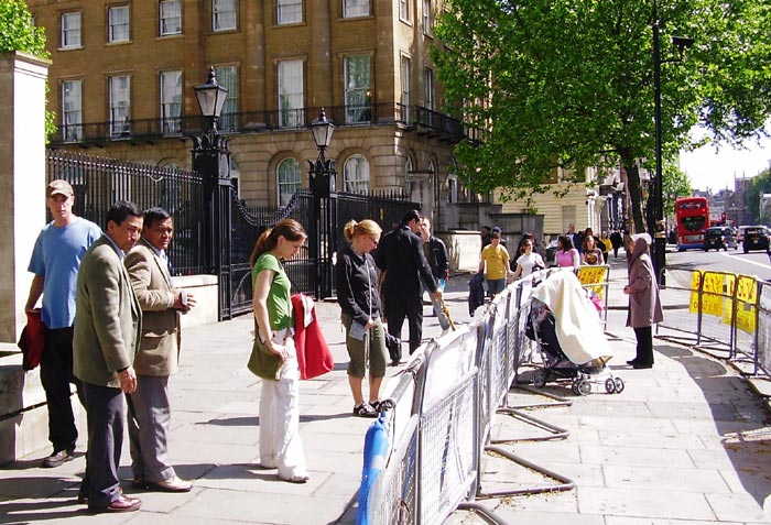 学员们申请的时间是周一至周五的下午2点到6点。在这个时间段里有大量的下班人群及游客。也因为这个时间段的关系,很多伦敦学员还在上班无法前往。这样一来,前往的学员多是不上班的带小孩的妈妈,和已退休的老年学员。这些法轮功学员们在风雨无阻的讲真相中,使该区域众多政府部门大楼上班的工作人员和来来往往的其他上班族群中的许多人拿到了法轮功真相传单,看到了学员们展示的祥和舒缓的法轮功功法,看了在唐宁街10号——首相府的街对面设立的小型图片展。