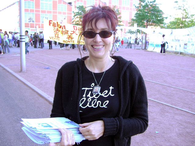 一位法国女士帮助学员发送法轮功真相资料,她说:“ 原先我来的目地是声援西藏人权的,我没有找到他们,却在这儿碰上了他们(法轮功学员)。因为我是人权捍卫者,我认为我们必须抵制与人类文明相违背的各种野蛮行径。今天中国队被邀请参加比赛,这是一个好机会。这种(对中共迫害的)抗争对维护人性尊严是很重要。”