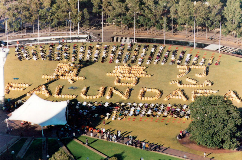 次日,1999年5月3日清晨七点钟,与会的各国法轮功学员在悉尼著名景点达令港大草坪上集体炼功。当时,湛蓝的天空下,如茵的绿草地上,随着优美动听的炼功音乐,身穿黄色T-恤衫的法轮功学员整整齐齐的排成“真、善、忍”和英文的“法轮大法”等字样,在集体炼功,远远看去,好看极了。