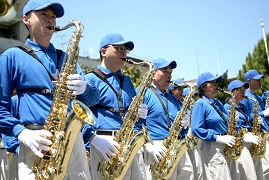 ![]() 张亮(左一)在美西天国乐团中 | ![]() 张亮(左)在声援中国民众退出中共邪党的活动中 |