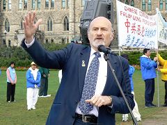 二零零六年九月二十六日,法轮功支持者和多名国会议员在加拿大国会山前集会,呼吁加拿大政府和人民共同制止中共活体摘取法轮功学员器官的罪行。