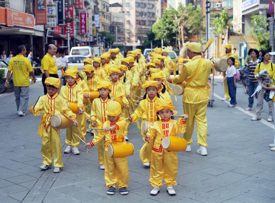 飘逸出众的仙女队伍紧随,其后为上百名法轮功学员组成的炼功方阵,随后写着「法轮大法」的蓝底黄字大方旗队和黄底红字的小三角型旗队组成庄严殊胜的「法轮大法」旗海,旗海后方是小小弟子腰鼓队,整列游行队伍则是由成年大法弟子腰鼓队压后。游行队伍以稳健步伐走过永和市主要街道;吸引不少沿街商店、住家、路人关注,甚至索要真相材料。