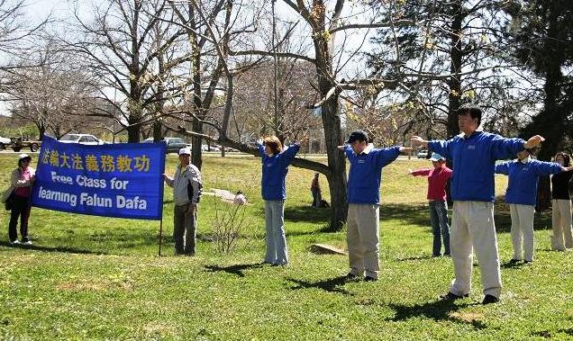 【明慧网二零零七年十月三日】二零零七年九月十二日和十三日,美国科罗拉多州法轮功学员参加了在丹佛市中心奥瑞校园的世界友谊秋季节。学员做了功法演示,向学生们发真相资料并手工制作了很多带有洪法书签的莲花。四百多名学生和学校工作人员在“制止中共迫害法轮功”的黄布上声援签名。人们对在中国遭受八年迫害的法轮功学员表示同情,对中共活体摘取法轮功学员器官的暴行表示愤慨。