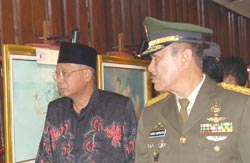 ![]() 印尼第五军区柏拉伟佳雅总司令祥素勒•马巴瑞巴〔左二〕以及东爪哇地区的回教委员领导人阿杜勒•梭码特〔左三〕分别接受了泗水法轮功学员所赠送的纪念品。 |