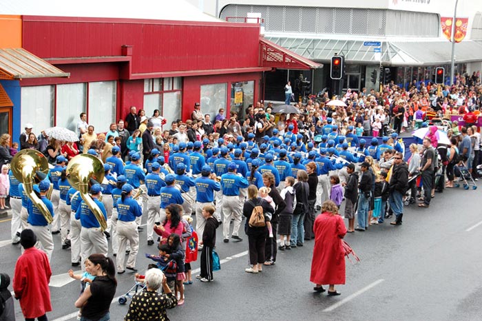 【明慧网二零零七年十二月十日】二零零七年十二月九日,新西兰哈密尔顿市在细雨中举行了一年一度的圣诞游行。由天国乐团、花车和仙女组成的法轮功方阵赢得了观众的热烈欢迎。