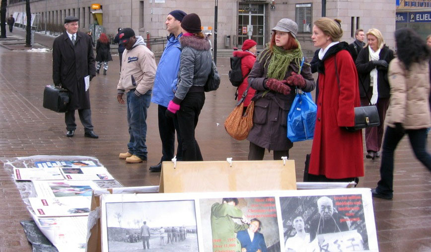 一位芬兰男士问法轮功学员小王,中共为什么迫害法轮功?天安门自焚案是怎么回事?当小王告诉他,天安门自焚案完全是中共编导出的一场特大假案时,他说:太残忍了,你们做的对。然后他仔细地看了展板,接着前去签名声援退出中共邪恶组织。