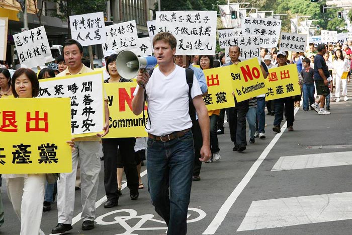 住在游行集合附近的八十多岁,祖籍广东的马阿姨,听到咚咚的鼓声,跑来一探究竟。当她看到「退出共产党」的展板时,不禁回忆起中国共产党对她家族的种种迫害。