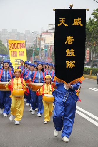 声援大会结束后与会民众以和平的游行活动绕行新竹市区,向对岸退党勇士表示声援和祝贺。由于适逢周末,游行场面壮观,法轮功学员组成的天国乐团、唐鼓队、乾坤鼓乐队、新唐人旗鼓队的鼓乐声,「中共邪灵的根都拔起来了」、「中共逆天行 解体在眼前」、「天灭中共」、「普天同庆」等横幅迎风飘扬,吸引许多观众驻足观看。