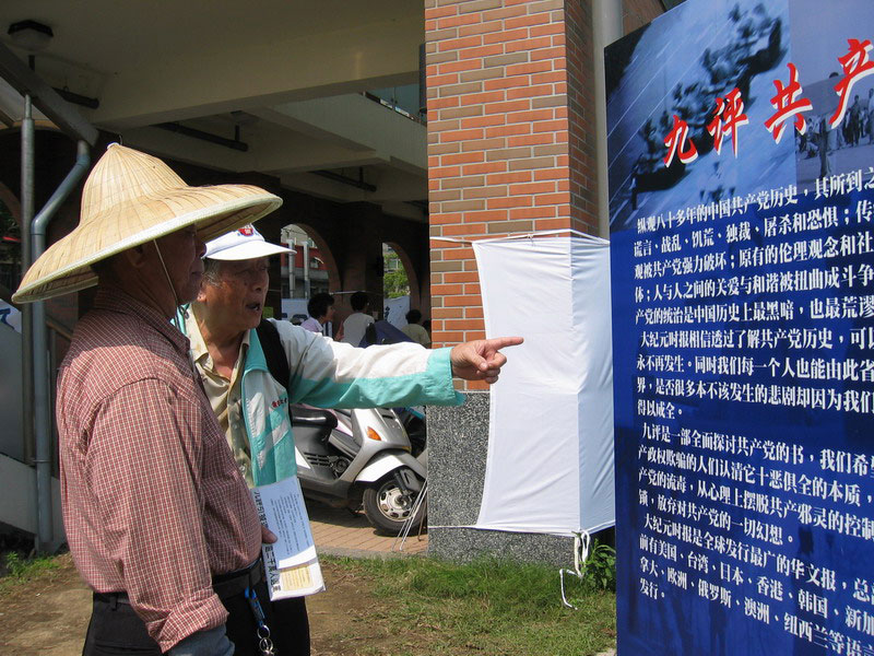 有一位参与活动的老伯,很耐心的一字一句和一位当地的李老先生解说九评展板的简体字内容。而李老伯仔细听完后,表示很认同。他明白真相后表示,这活动很有意义,李老伯还很有正义感的说「应该让这些退党人士到台湾来寻求庇护。」