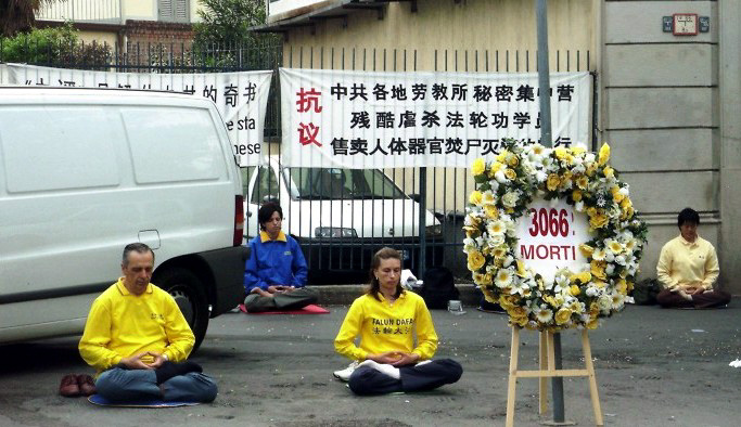 二零零七年四月二十五日,意大利法轮功学员再次来到米兰中领馆前,纪念“四·二五”这一特别的日子,谴责中共对法轮功的迫害。从二零零一年开始,只要中领馆开门办公,在这里总是有法轮功学员谴责迫害、讲述真相的身影。近七年的时间里,他们从未间断过,其中有当年参加“四·二五”大上访的老学员,也有得法不久的新学员。他们用行动展示法轮大法的尊严,揭露迫害的邪恶和残酷。米兰中领馆前面已经成为许多中国人办理退党和了解法轮功真相、甚至得法修炼的重要地点。