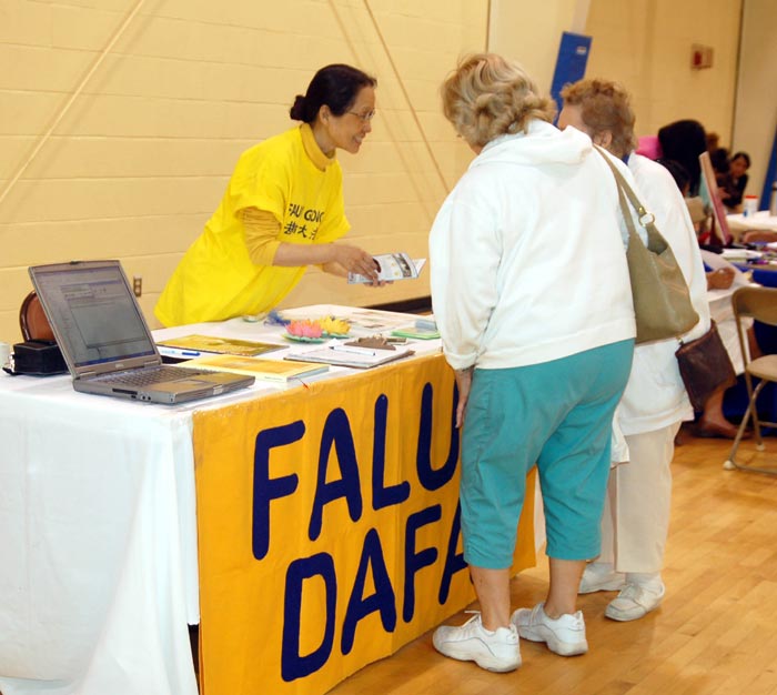 法轮功学员在丹福YMCA成人日的摊位上介绍大法真相。