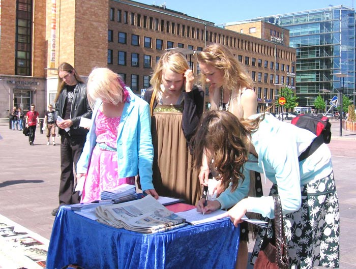【明慧网二零零七年六月四日】二零零七年六月二日,芬兰退党服务中心、大纪元义工和赫尔辛基法轮功学员在市中心举办声援二千二百多万中国人退出中共及相关组织的活动。