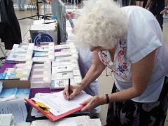 过往的行人被法轮功学员的坚韧和善良所打动,被揭露中共酷刑的模拟演示所震惊。在当今的世界上还有如此的暴行,真是人类文明的耻辱。他们驻足观看,接受真相传单,他们和法轮功学员交谈,以期了解更多的详情。很多人在征签表上签了名,