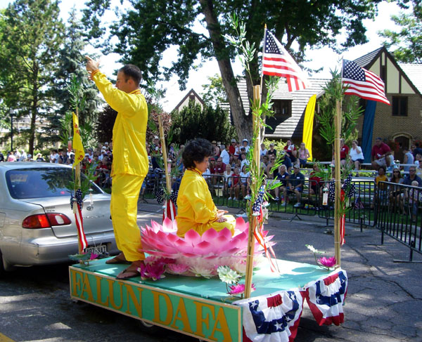法轮功学员身着金黄色炼功服,在花车和莲花座上打坐并演示动功,仙女开道,腰鼓压阵,赢来观众阵阵掌声。学员们准备的几百朵悬挂着洪法书签的手折小莲花很快就被孩子们索要一空。