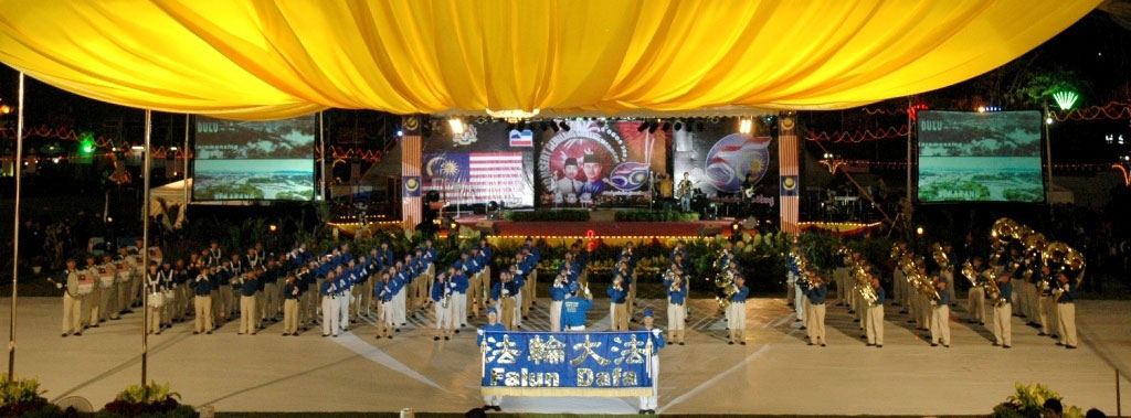 【明慧网二零零七年八月三十一日】马来西亚沙巴州(Sabah)首府哥打晋那巴鲁市政局于二零零七年八月三十日晚七时开始安排一系列庆典项目迎接国庆的来临。节目开始之前,来自台湾的天国乐团演奏四首乐曲,为活动拉开序幕。由大约一百二十人组成的天国乐团在十五分钟内演奏了“法轮大法好”、“法鼓法号震十方”、“法正乾坤”以及“送宝”,雄壮的乐曲震撼全场。