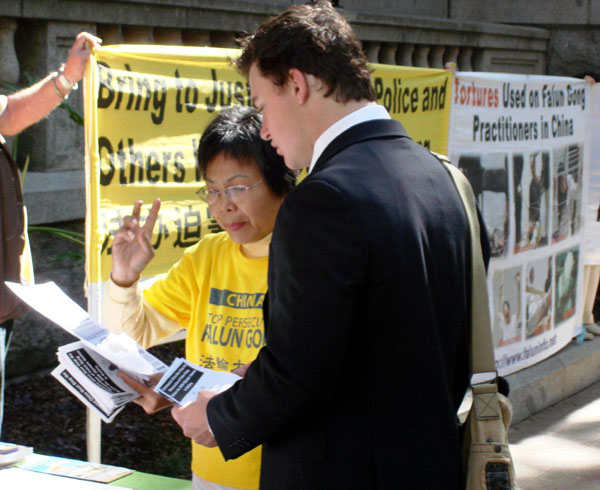 过往行人前来了解法轮功真相之后,主动在制止迫害的请愿书上签字。