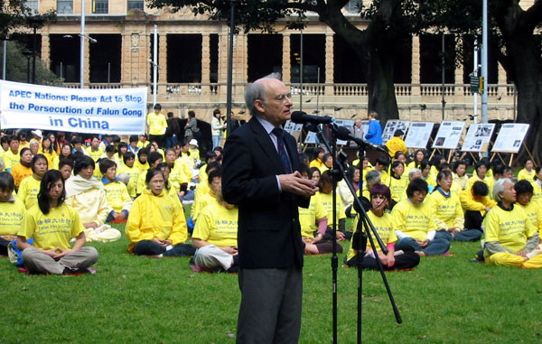 来自加拿大的律师大卫•麦塔斯先生发言说,我们为什么要重复同样的话,是因为亚太经合会首脑们保持同样的沉默。人权属于每一个人。为人权抗争,不仅仅是人权团体的事,更应该是那些被认为是代表选民利益的首脑人物的事情。我们必须从现在开始为法轮功的权益抗争。