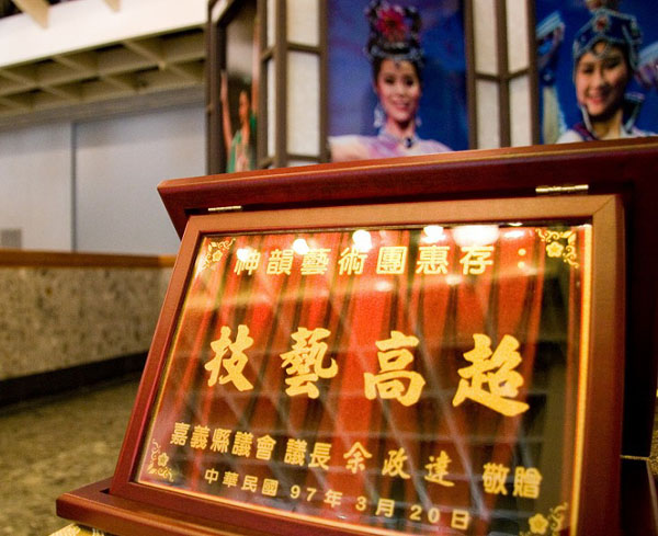 二十日午后,中正大学大礼堂前广场,等待入场观看神韵的民众已排成了一条长龙;在祥和的迎宾声中,立法委员江义雄及夫人、前立委庄和子、民雄乡长陈福成及夫人、竹崎乡长王昆弘及夫人、云林科技大学教授何明冠,还有前斗六正心中学校长吴友梅相继从人群里走进礼堂大厅。最引人注目的是,由国立后壁高中蔡坤锦老师带领的四十位美工科学生,浩浩荡荡的走进来,一位学生雀跃的说:“这是我们的校外参观实习课,观赏神韵艺术团。”