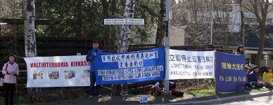 二零零八年四月二十五日上午,芬兰部份法轮功学员一早来到中国驻芬兰大使馆前,打出“强烈抗议中共利用奥运加重迫害法轮功”、“立即停止迫害法轮功”、“法轮大法好”等横幅 ;并用喇叭一遍遍的以中文、芬兰文向来办理签证的中外人士,讲述着四•二五的由来、及九年来全世界大法弟子理性反迫害、坚持不懈讲真相的历程。