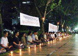 印尼法轮功学员来到中使馆前举行烛光纪念活动