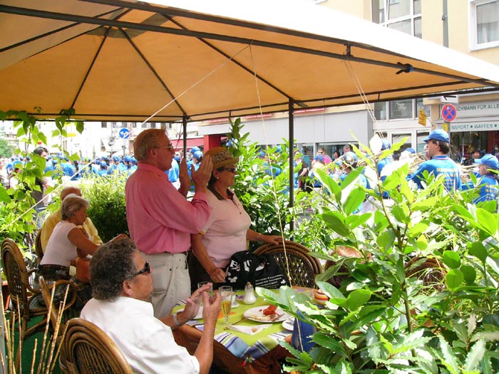 法轮大法协会的游行方阵内容丰富,包括天国乐团、法轮功功法演示、中国传统舞蹈等,还有一个方阵揭露了中共对法轮大法长达九年的残酷迫害。沿途的观众们报以热烈的掌声,无论记者还是普通市民都纷纷举起相机,希望留下这精彩的画面。