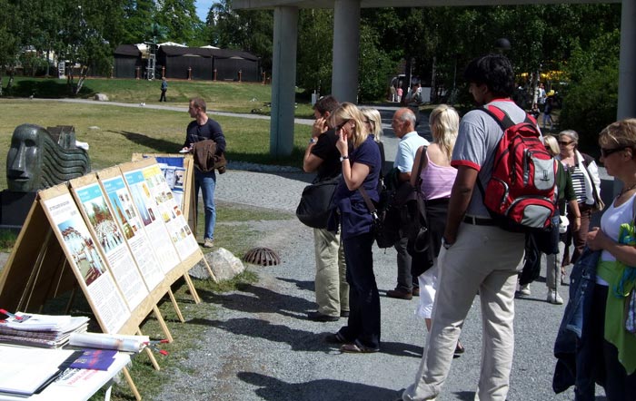 进入夏日以来,为了让更多的民众了解法轮功真相,瑞典法轮功学员总是利用周末假日的机会来到这个著名的旅游景点旁洪法炼功、讲真相。当天上午不到十点,学员就挂上了醒目的横幅,摆放好展板,介绍法轮大法洪扬全世界的盛况,并揭示法轮功学员在中国无辜遭受的残酷迫害。学员们还同时进行法轮功五套功法的演示。