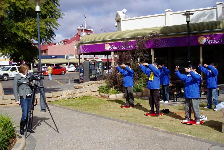 ![]() 西澳法轮功学员在卡尔古丽(Kalgoorlie)市中心洪法与讲真相。WIN电视台记者摄影并采访法轮功学员 |