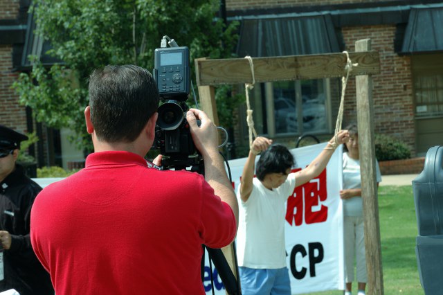 ![]() WCBI电视台记者在拍摄中共的吊打酷刑演示。 |