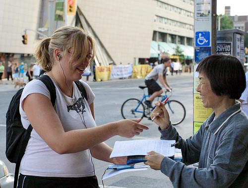 ![]() 路人在制止中共迫害法轮功的呼吁书上签名 |