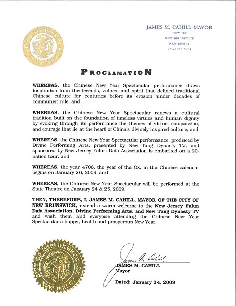 神韵在新泽西州演出的州立大剧院(State Theatre)所在城市新布朗斯韦克(New Brunswick)市长卡黑尔(James Cahill)在褒奖状中祝愿所有观看中国新年晚会的观众拥有一个快乐、健康和吉利的新年。纽瓦克(Newark)是NJPAC剧院的所在市,市长克瑞.布克(Cory Booker)在贺信中表示:在我们迎接牛年到来之际,我非常高兴欢迎你们到我们纽瓦克市这座漂亮的新泽西表演中心(NJPAC),观看由神韵艺术团主演、新唐人电视台制作的中国新年晚会。纽瓦克市议会议长克兰普(Mildred Crump) 以及其他八位市议员共同签署议案表彰神韵艺术团的演出。