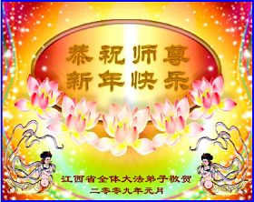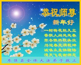 随着岁月的流失,又一个新年即将到来。在这辞旧迎新的日子里,我们全乡镇的大法弟子向伟大的恩师拜年!祝师尊新年快乐!弟子们思念我们伟大的师尊。在这瞬间即逝的宝贵时间里,我们要紧跟师父的正法進程,去掉各种执著,精進实修,学好法,做好三件事,比学比修,整体升华,整体提高。圆容师尊所要的,不辜负恩师的期盼。完成我们肩负的重任——救度众生,圆满随师把家还。谢谢恩师。
