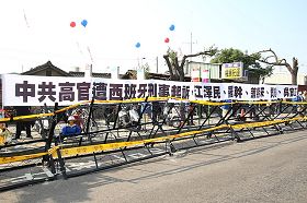 下午,法轮功学员陆续集结到裕元酒店前未管制的路段,制止迫害的横幅与黄色的炼功服构成一条显目的长龙,蜿蜒在中港路上。不论中共官员从哪儿进出,都躲不过法轮功学员制止迫害的呼声。