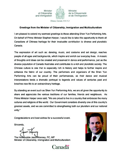 加拿大公民、移民暨多元文化部长肯尼在贺信中感谢华人社区对加拿大多元文化的贡献。他说,中国文化含有特别丰厚的历史。“神韵的演员们应该为他们的表演感到自豪。他们的舞蹈和音乐把数百年前的价值与传奇呈现出来,给这份奇妙的遗产注入了新的生命。”