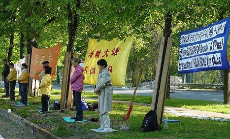 一对骑自行车路过的德国夫妇,特意下车,走到横幅前观看,当得知,修炼法轮功的人们在中国遭受迫害时,他们立即表示同情,并了解共产极权对人的信仰和传统文化的压制。