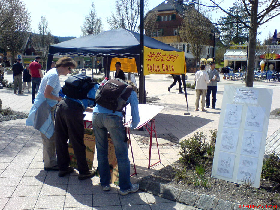 【明慧网二零零九年四月二十七日】二零零九年四月二十五日在德国西南黑森林景区的缇缇湖(Titisee)畔,部份德国、瑞士法轮功学员在四二五十周年纪念日之际,向来自世界各国的游客,讲清真相,揭露中共对法轮功长达十年的残酷迫害。缇缇湖也是中国旅游团常到的景点,今天法轮功学员继续对到来的中国游客讲清真相,劝“三退”(退党、退团、退队)。