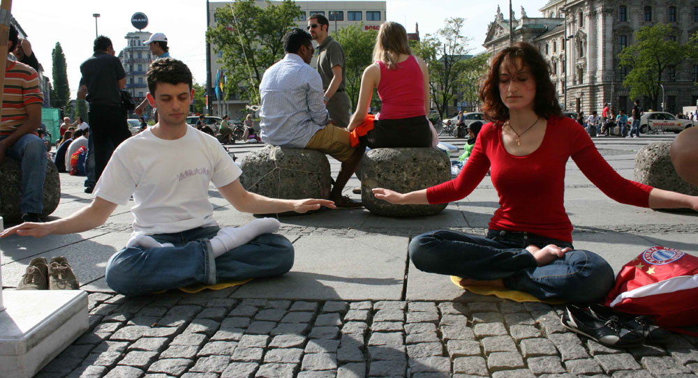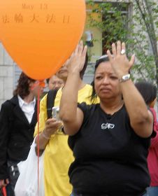 瑞吉纳•奈姆尼女士(Regina Nemni)静静地注视着这个由各族裔、不同背景、从四~五岁到九十多岁的人们组成的炼功场,久久不愿离去。第一次接触法轮功的瑞吉纳说:“他们是那么的祥和,这令我感动。他们能够在喧嚣的广场上深深地入定,其中有一种力量打动着我的心灵。他们带给这个世界的是人类的希望。”