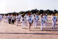 早上十时,祥和的炼功音乐在九龙长沙湾游乐场响起,数百学员在九龙长沙湾游乐场集体炼功。中午过后,天国乐团响亮雄伟的演奏,揭开了世界法轮大法日的庆祝活动。数百大法弟子列好队形,双手合十,喜气洋洋的齐声恭祝师尊生日快乐,随后高唱“法轮大法好”。