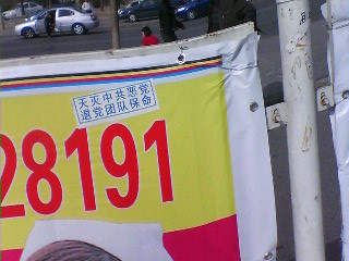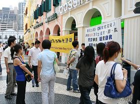 ![]() 大陆游客观看展板,了解法轮功真相。 |