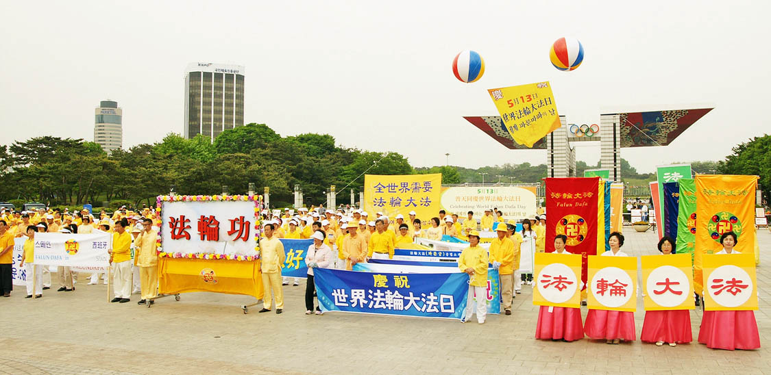 十日,大约千余位韩国法轮功学员聚集于首尔的奥林匹克公园和平门,举行了“法轮大法”排字、诗朗诵、二胡演奏、歌曲演唱、集体炼功、绕公园游行等活动。