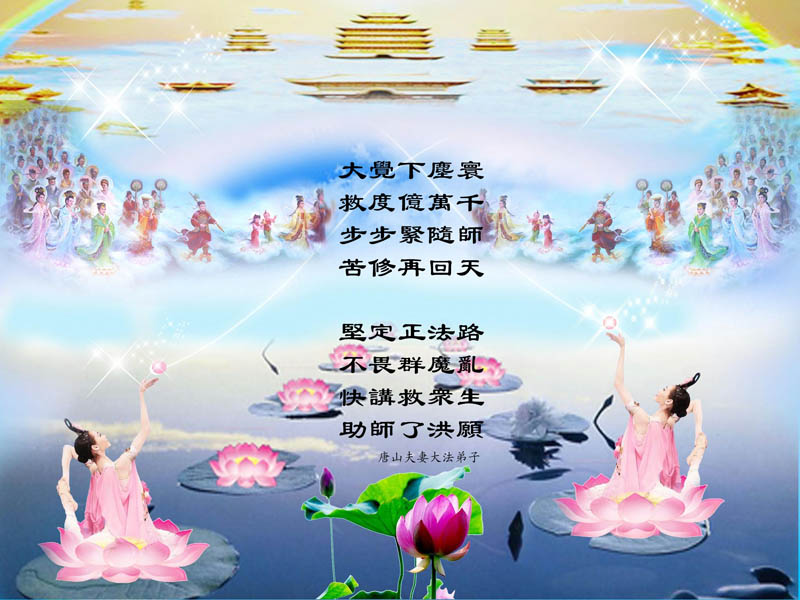 慈悲伟大的师尊您好!我们不管身在何处,不管在什么环境中,也不管在什么形势下,都坚信师父、坚信大法,修好自己,同化大法,理智、认真的做好三件事,使众生得救,回归新宇。