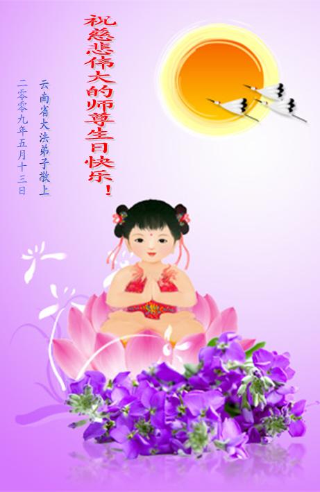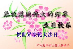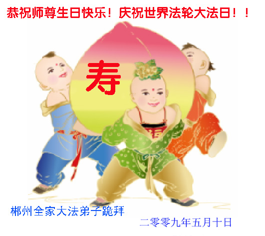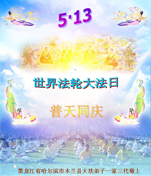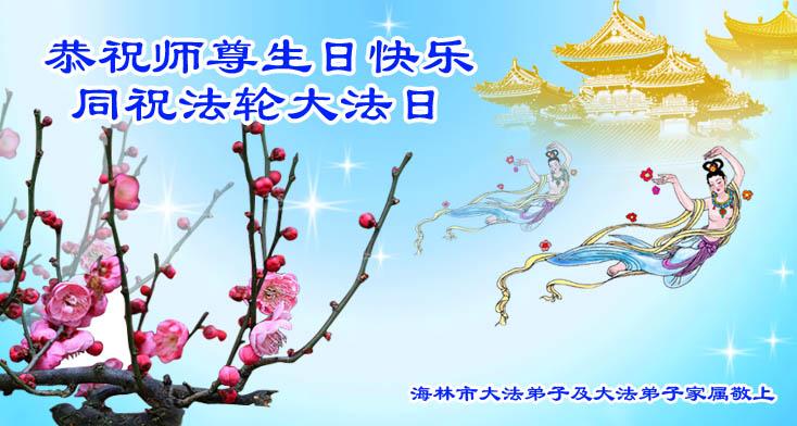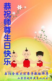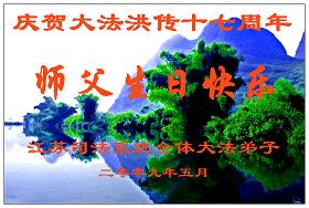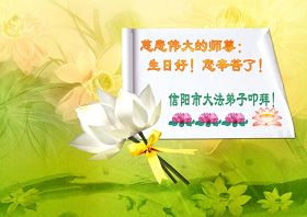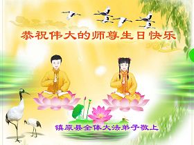 河南省某司法局的大法弟子恭贺世界法轮大法日!祝师父生日快乐!我们亲眼目睹了大法的神奇,受到师尊的呵护和慈悲救度。师父的恩泽,洪大的慈悲,用尽人类最美的语言都难以表达和赞美。在这人神共存,新旧宇宙交替的时刻,我们更加珍惜这稍纵即逝的时机,抓紧救度众生,灭尽最后的邪恶,圆满随师还!